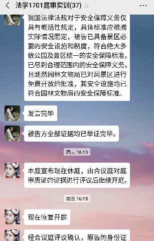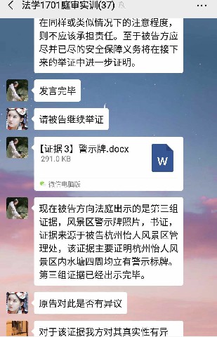 在之后的法庭辯論階段,法官組學(xué)生依照民事訴訟法規(guī)定的程序進行審理,原告組、被告組學(xué)生根據(jù)審判長的指揮分別發(fā)出起訴狀、答辯意見、證據(jù)圖片在微信群上,由此展開舉證、質(zhì)證,向證人發(fā)問。