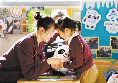 圖為教師帶領(lǐng)孩子們了解北京冬奧會(huì)吉祥物,學(xué)習(xí)冬奧知識(shí)。