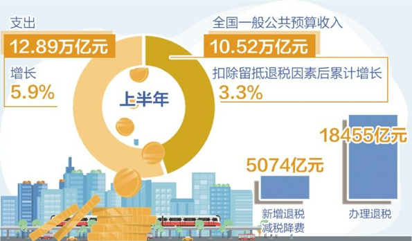 總體看,今年上半年預(yù)算執(zhí)行情況總體較好。統(tǒng)計顯示,上半年全國一般公共預(yù)算收入105221億元,扣除留抵退稅因素后累計增長3.3%;支出12.89萬億元,同比增長5.9%,高于財政收入增幅。此外,上半年新增退稅減稅降費(fèi)5074億元、辦理退稅18455億元,有效提振市場主體信心;累計發(fā)行新增專項債券3.41萬億元。