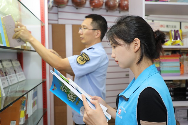 9月23日,吳興區(qū)埭溪鎮(zhèn)市場監(jiān)管所工作人員、網(wǎng)格員在轄區(qū)一家書店對書籍、進(jìn)貨票據(jù)等進(jìn)行檢查。