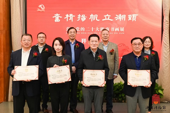 隨后,各相關(guān)單位領(lǐng)導(dǎo)與全球浙商代表紛紛為“喜迎黨的二十大浙商書畫展”送上祝福。浙江省慈善聯(lián)合總會(huì)會(huì)長陳加元,省工商聯(lián)一級(jí)巡視員趙小敏省僑聯(lián)二級(jí)巡視員陳林,浙江工商大學(xué)黨委委員、宣傳部部長丁一志分別為參展浙商頒發(fā)收藏證書。