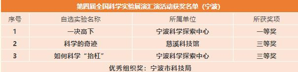近日,第四屆全國科學(xué)實(shí)驗(yàn)展演匯演活動(dòng)獲獎(jiǎng)名單公布。由寧波市科技局選派,寧波科學(xué)探索中心自選實(shí)驗(yàn)《一決高下》榮獲一等獎(jiǎng),慈溪科技館自選試驗(yàn)《科學(xué)的奇跡》、寧波科學(xué)探索中心自選實(shí)驗(yàn)《如何科學(xué)“抬杠”》獲三等獎(jiǎng),寧波市科技局獲優(yōu)秀組織獎(jiǎng)。獲獎(jiǎng)數(shù)量、質(zhì)量均位居全國同類城市前列。