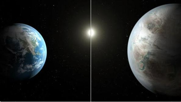 這張美國(guó)航天局2015年7月23日公布的效果圖顯示的是地球(左)和太陽系外行星開普勒-452b。 新華社發(fā)