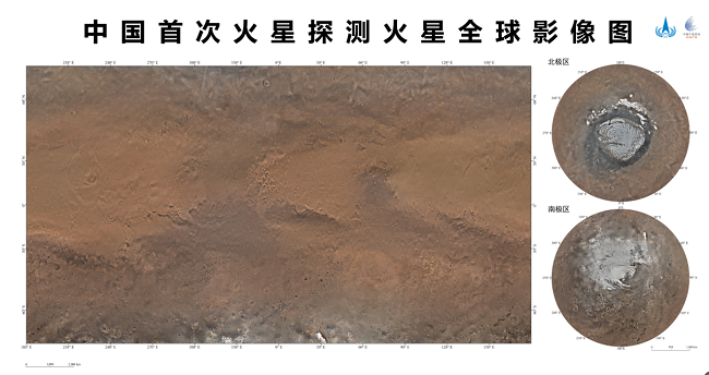 我國(guó)首次火星探測(cè)任務(wù)——天問一號(hào)獲取的包括影像圖在內(nèi)的一批科學(xué)探測(cè)數(shù)據(jù),將為人類深入認(rèn)知火星作出中國(guó)貢獻(xiàn)。天問一號(hào)任務(wù)環(huán)繞器中分辨率相機(jī),于2021年11月至2022年7月歷時(shí)8個(gè)月,實(shí)施了284軌次遙感成像,對(duì)火星表面實(shí)現(xiàn)了全球覆蓋。地面應(yīng)用系統(tǒng)對(duì)獲取的14757幅影像數(shù)據(jù)進(jìn)行處理后得到火星全球彩色影像圖。