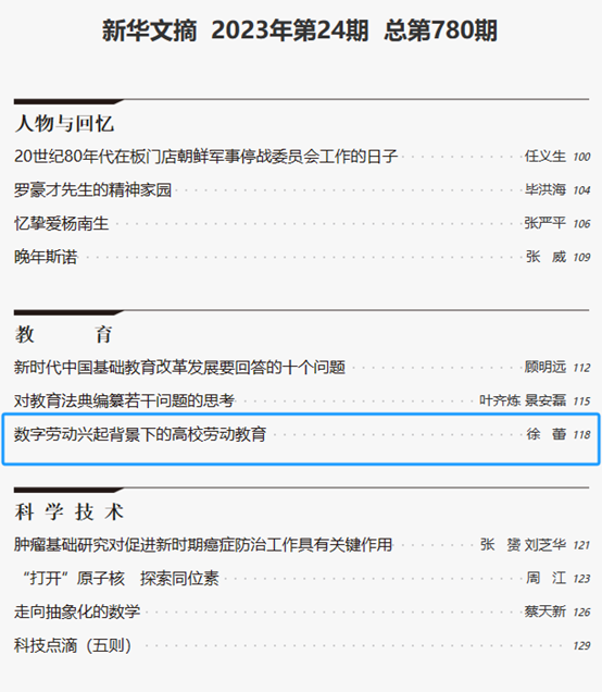 近日,浙江工商大學工商管理學院徐蕾教授撰寫的論文《數(shù)字勞動興起背景下的高校勞動教育》被《新華文摘》2023年第24期全文轉(zhuǎn)載。