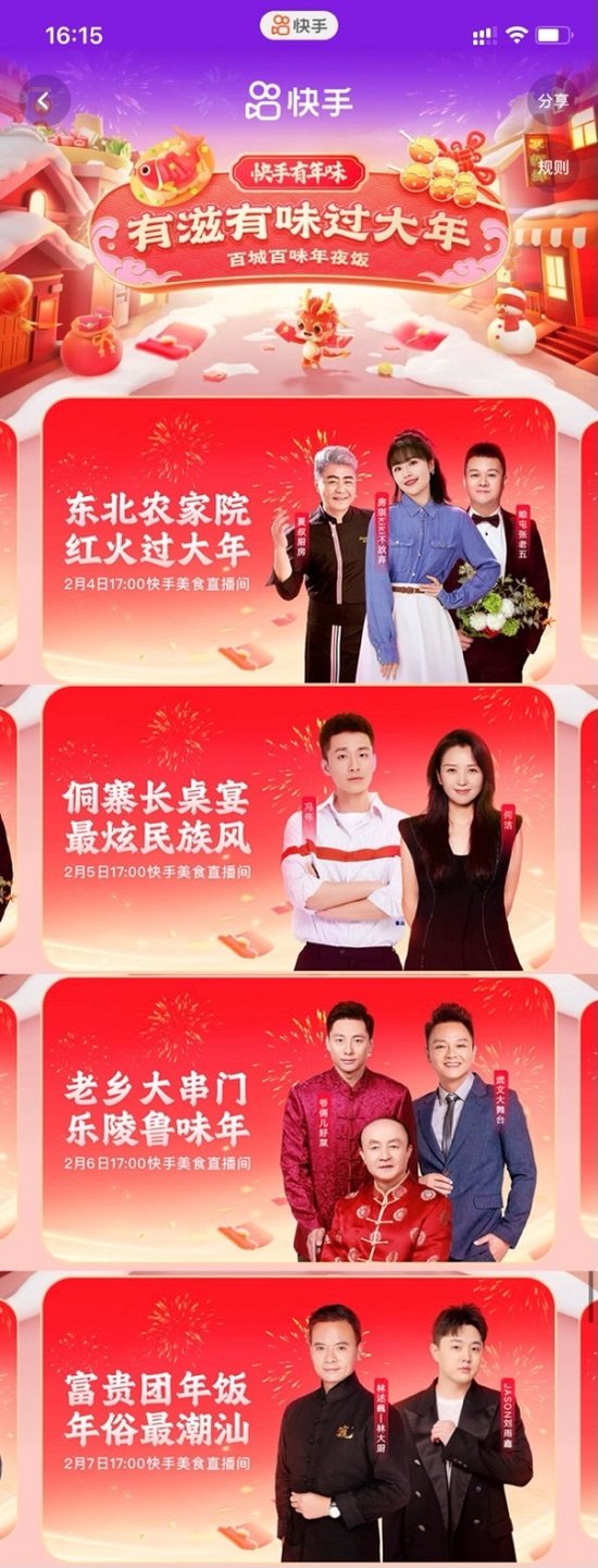 百城百味年夜飯,有滋有味過大年,2月4日至2月7日,快手將鏡頭推向老百姓的新年餐桌,與明星何潔,國宴名廚@夏叔廚房、@馮偉Nemo、@爺倆兒好菜高炳義師徒、@林述巍,以及快手創(chuàng)作者@房琪kiki不放棄、@咱屯張老五、@武文大舞臺、@JASON劉雨鑫,走進(jìn)東北四平、貴州侗寨、山東樂陵、廣州潮汕四地,大秀廚藝解鎖普通人的年夜飯新菜單。在一道道美食烹制的過程中,不僅還原了當(dāng)?shù)靥厣L(fēng)味,更抒發(fā)了大家對團圓的滿足與期待。