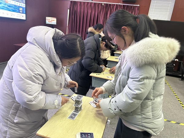 “我覺得立方體的承重能力更強!蹦昙壗M教師在科學(xué)教師的帶領(lǐng)下分組討論,確定如何搭建穩(wěn)定、承重能力強的紙牌高塔并動手實踐。一張張紙牌在老師們的手中或彎曲或折疊,造型獨特的紙牌塔漸次升高,靈巧的雙手不斷地“添磚加瓦”。經(jīng)過半個小時的努力,形態(tài)各異的紙牌高塔呈現(xiàn)在大家面前。