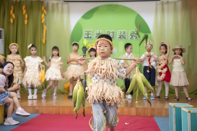 在散學式的玉米時裝秀現(xiàn)場,玉米實現(xiàn)了華麗變身,造型多樣的手工藝品,色香味俱全的玉米美食,時尚的玉米裝扮,學生們發(fā)揮自己的小巧思,讓玉米元素綻放在校園的每一個角落。