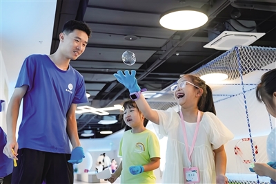 “小候鳥”們一走進(jìn)流動科技館,就被各種神奇的現(xiàn)象所吸引,迫不及待地向志愿者提問:“3D打印機(jī)是怎么打印出各式各樣小模型的?”“錐體為什么會從下往上滾動?”“戴上‘衍射墨鏡’為什么看到的光斑是愛心形狀的?”“小小的‘馬德堡半球’為什么拉不開呢”……志愿者們結(jié)合生活實(shí)際,邊動手邊講解,向“小候鳥”們科普各類科學(xué)原理,讓“小候鳥”們通過觀察、實(shí)驗(yàn)和思考,親身感受科技的神奇與魅力。