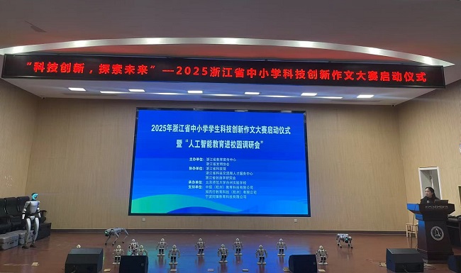 動(dòng),倡導(dǎo)中小學(xué)生探索未來、永保好奇心。省科技廳科技人才與科普處顧秋陽指出今天舉辦的2025年浙江省中小學(xué)學(xué)生科技創(chuàng)新作文大賽啟動(dòng)儀式暨“人工智能教育進(jìn)校園調(diào)研會(huì)”意義非凡。新修訂《科普法》指出,中小學(xué)校、特殊教育學(xué)校應(yīng)當(dāng)利用校內(nèi)、校外資源,提高科學(xué)教育質(zhì)量,完善科學(xué)教育課程和實(shí)踐活動(dòng),激發(fā)學(xué)生對科學(xué)的興趣,培養(yǎng)科學(xué)思維、創(chuàng)新意識(shí)和創(chuàng)新能力。省科技廳堅(jiān)持在“雙減”工作中做好科學(xué)教育加法,積極開展科技資源科普化托舉青年科技人才等試點(diǎn)工作,協(xié)同推進(jìn)“千名科學(xué)家進(jìn)校園播種”行動(dòng),組織科學(xué)家擔(dān)任科學(xué)副校長,開展科學(xué)精神教育和科學(xué)家故事創(chuàng)作等活動(dòng),取得了一系列成效。此次以“科技創(chuàng)新探索未來”為主題舉辦中小學(xué)學(xué)生科技創(chuàng)新作文大賽,從“我心中的科技館”、“心動(dòng)的科普內(nèi)容”等角度提升青少年的科技創(chuàng)新素養(yǎng)和人文素養(yǎng),具有重要價(jià)值。