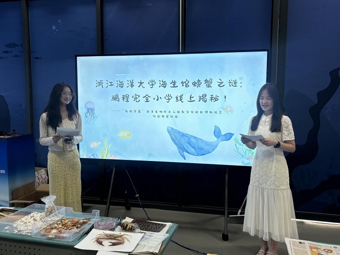 在海洋生物博物館整體講解環(huán)節(jié),實(shí)踐團(tuán)成員化身線上主播,與浙江海洋大學(xué)海洋生物博物館的講解員密切配合。講解員在現(xiàn)場進(jìn)行專業(yè)解說,直播鏡頭則如同“云端向?qū)А,帶領(lǐng)遠(yuǎn)在湖南的小學(xué)生們“漫步”博物館,逐一參觀館內(nèi)琳瑯滿目的海洋生物標(biāo)本陳列,讓孩子們對海洋生物博物館有了整體且直觀的認(rèn)識(shí)。