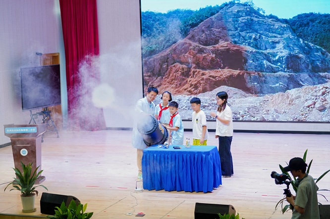 浙江省科普聯(lián)合會(huì)靠譜傳播團(tuán)隊(duì)成員仰晗、陳林孝帶來(lái)的科學(xué)實(shí)驗(yàn)秀《兩山有理:地球健康實(shí)驗(yàn)室》,通過(guò)妙趣橫生的互動(dòng)實(shí)驗(yàn),成功點(diǎn)燃在場(chǎng)學(xué)生對(duì)科學(xué)探索的好奇與熱情。