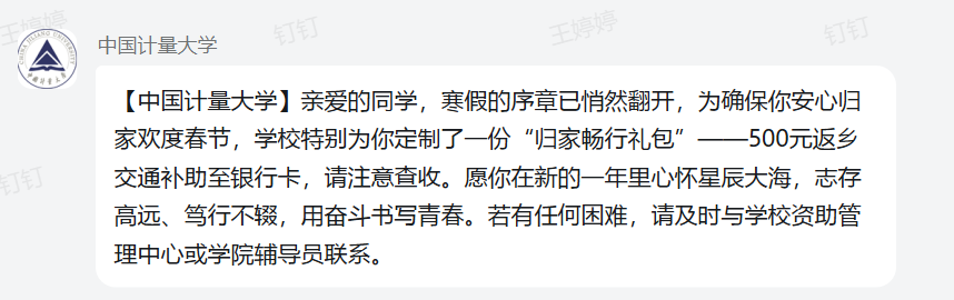 從返鄉(xiāng)路費的貼心助力到飯卡補貼的精準滴灌,從醫(yī)保政策的健康守護到暖心禮包的實物傳遞,中國計量大學的冬季慰問行動環(huán)環(huán)相扣,形成“保障型資助為基礎、發(fā)展性資助為重點”的多維體系。系列舉措不僅緩解了經(jīng)濟壓力,更在無形中傳遞尊重、增強自信、激發(fā)內生動力,讓“資助”與“育人”同頻共振。